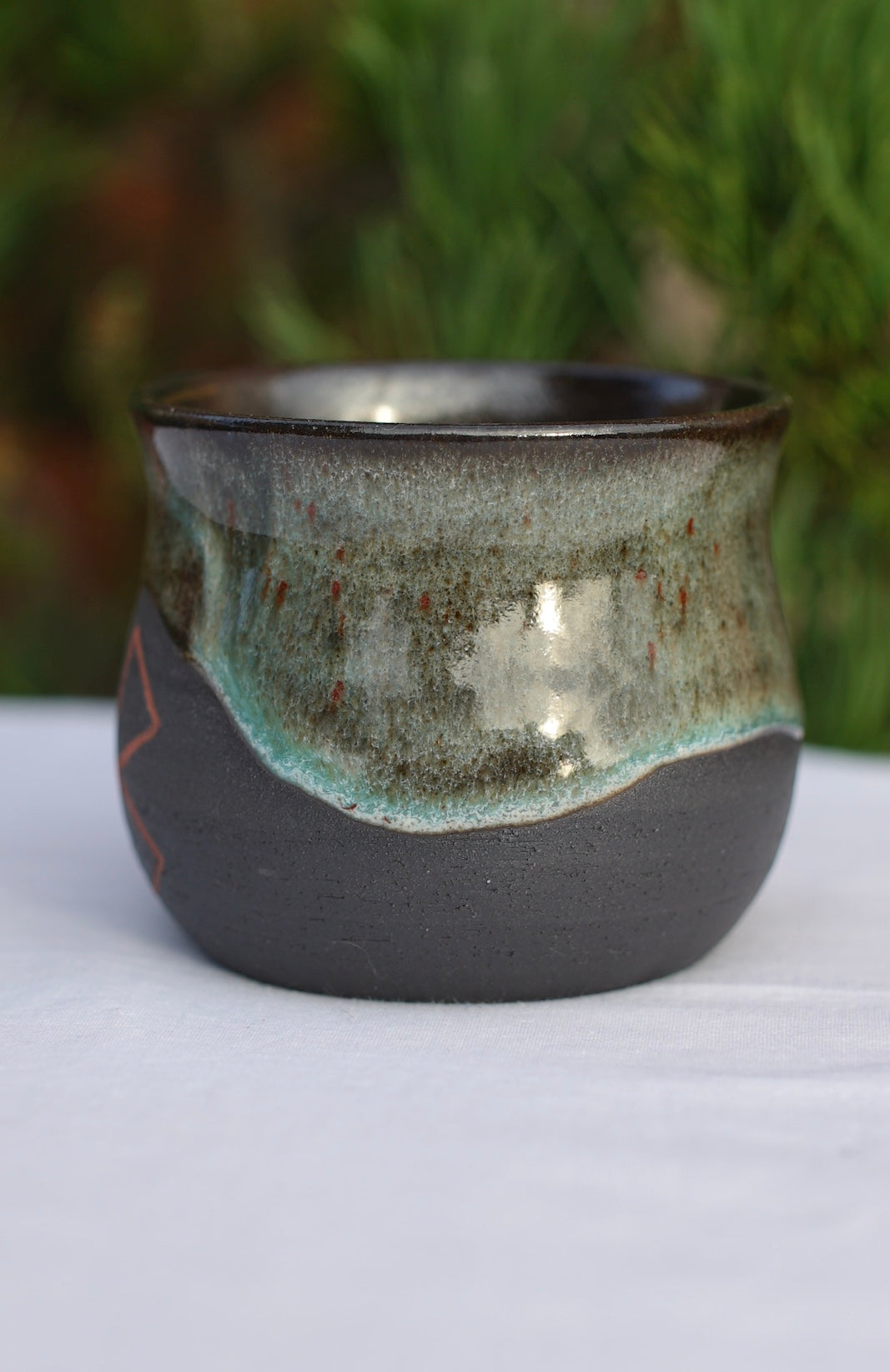 Der Becher fasst etwa 185 ml ist 6,5 cm hoch und etwa 8 cm breit. Sie wurde bei 1245Grad gebrannt.