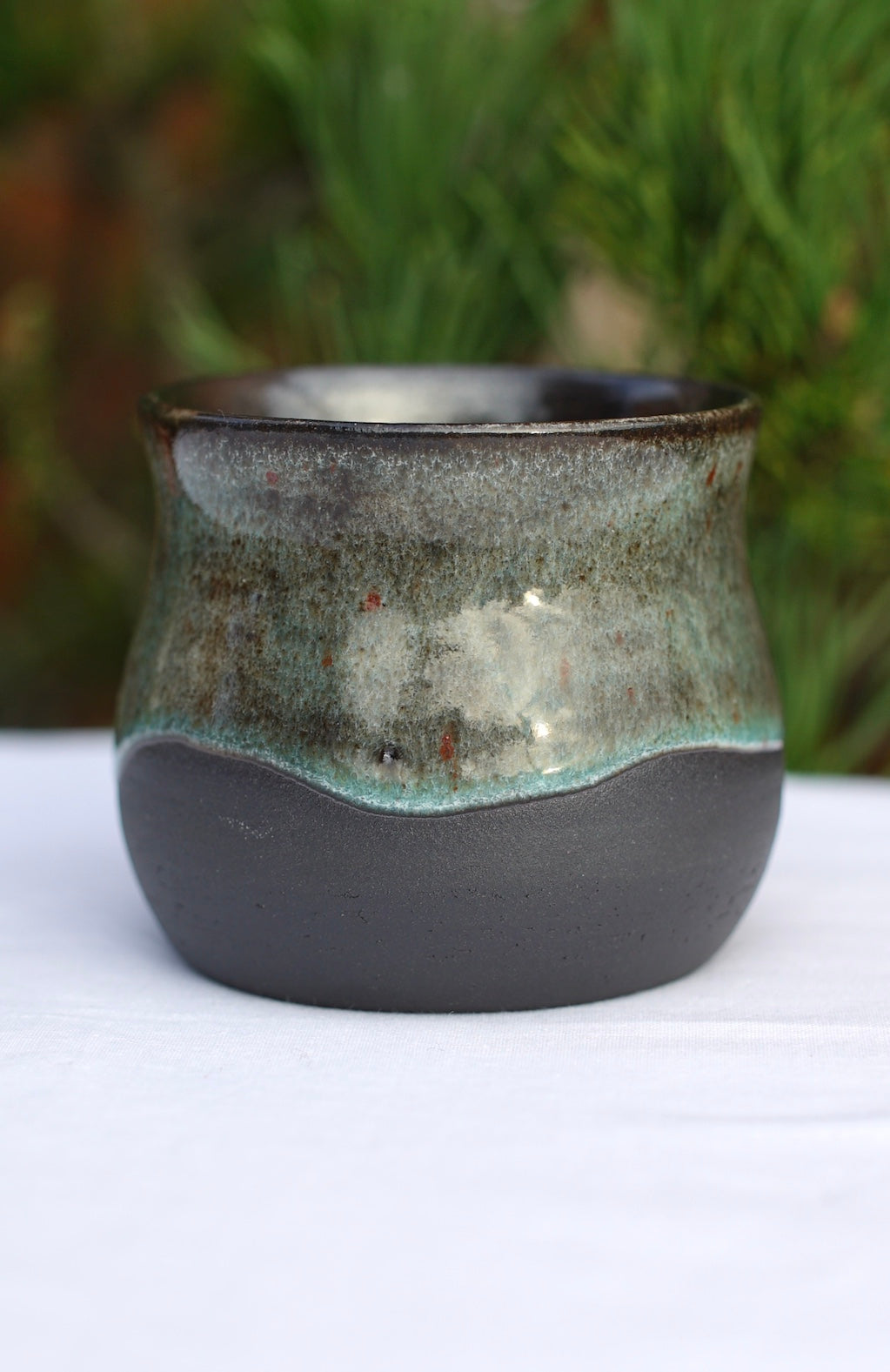 Der Becher fasst etwa 185 ml ist 6,5 cm hoch und 7,5 cm breit. Er wurde bei 1245 Grad gebrannt.