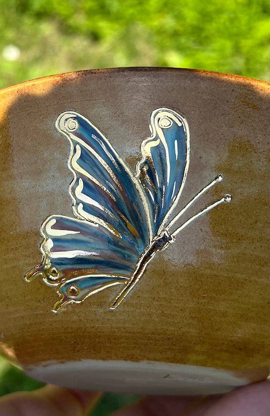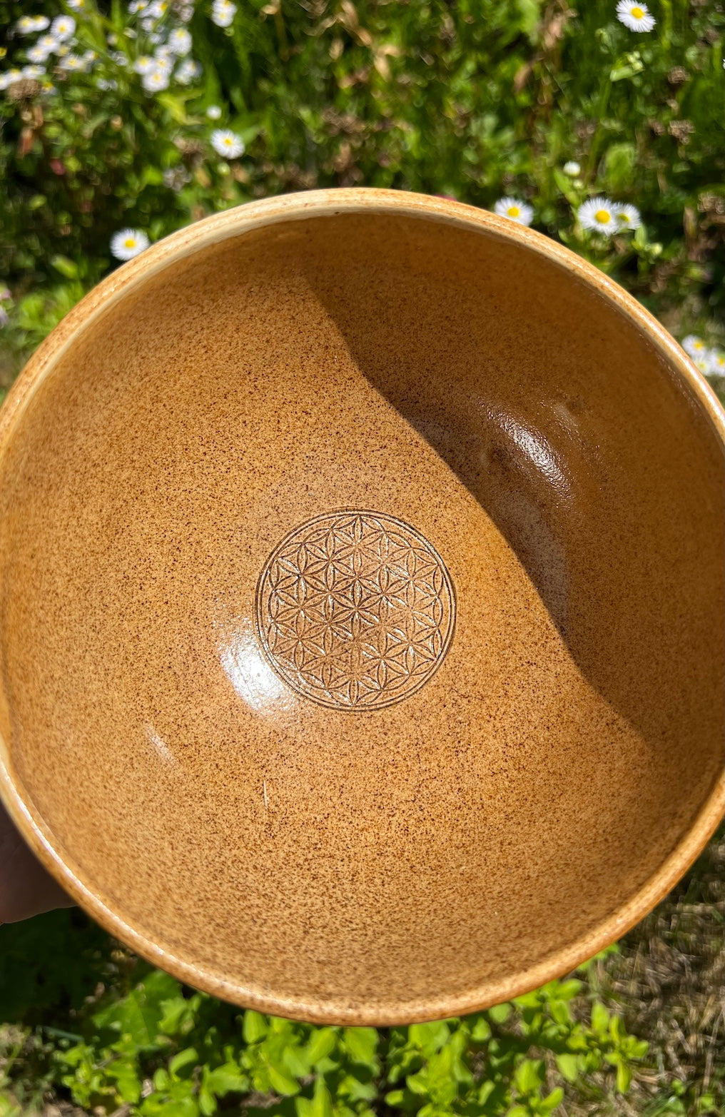 Diese Schale beflügelt dich mit Leichtigkeit und schenkt dir ein Stück mehr Lebensfreude. Er eignet sich perfekt für dein Frühstück, Suppe oder Salat. Sie wurde von mir in liebevoller Handarbeit an der Töpferscheibe gedreht. Der Schmetterling ist per Hand aufgemalt und später nach dem Glasurbrand vergoldet und in einem dritten Brand eingebrandt. Durch die Blume des Lebens innen und die eingebrachte Agnihotra-Asche, ist ein Genuss daraus zu trinken. Die Agnihotraasche ist im Ton und auch in der Glasur enthalten. Die Ascheglasur enthält keine chemischen Nebenstoffe und ist damit vollkommen natürlich. Diese Asche verändert die Kristalle der Getränke im Becher hin zu lebendigen hexagonalen Strukturen (nachgewiesen mit Kristallfotografie nach Masaru Emoto) macht sie so für den Körper besser verwertbar. Die Asche soll sogar dazu beitragen Schadstoffe durch Umwandlung zu neutralisieren. Lies gern hier mehr zur Wirkung der Lebensgefaesse-Agnihotra-Keramiken