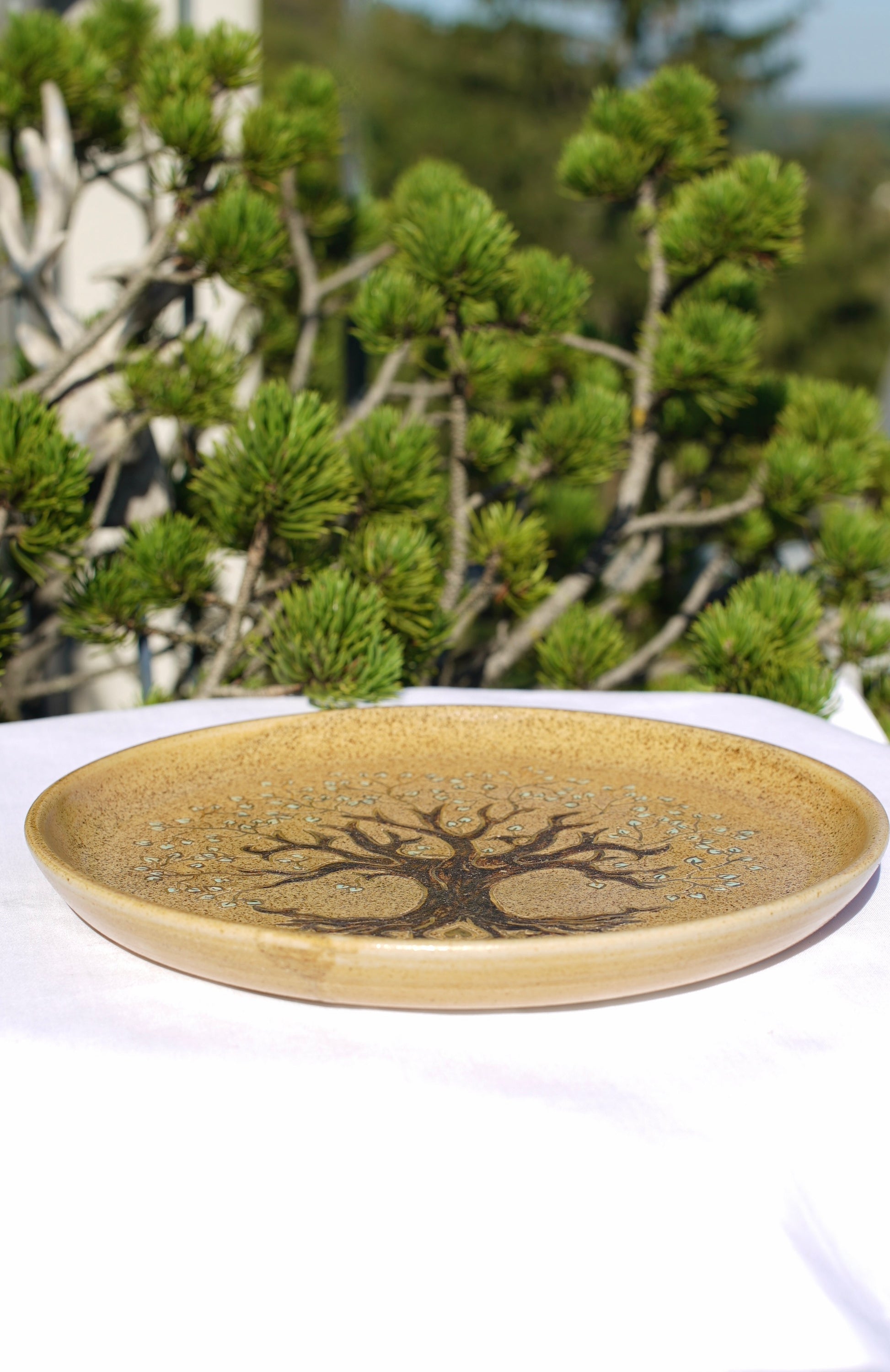 This plate was lovingly turned by hand on the potter's wheel and the tree of life was carved by hand. The contours are gilded with 24 carat gold and the tree trunk is made of healing earth. The Agnihotra ash inside makes it a pleasure to eat. The Agnihotra ash is contained in the clay and also in the glaze. The ash glaze contains no chemical additives and is therefore completely natural. This ash changes the crystals of the liquids in the food on the plate into living hexagonal structures (according to Masaru Emoto), making them easier for the body to utilize. The ash is even said to help neutralize harmful substances by transforming them.