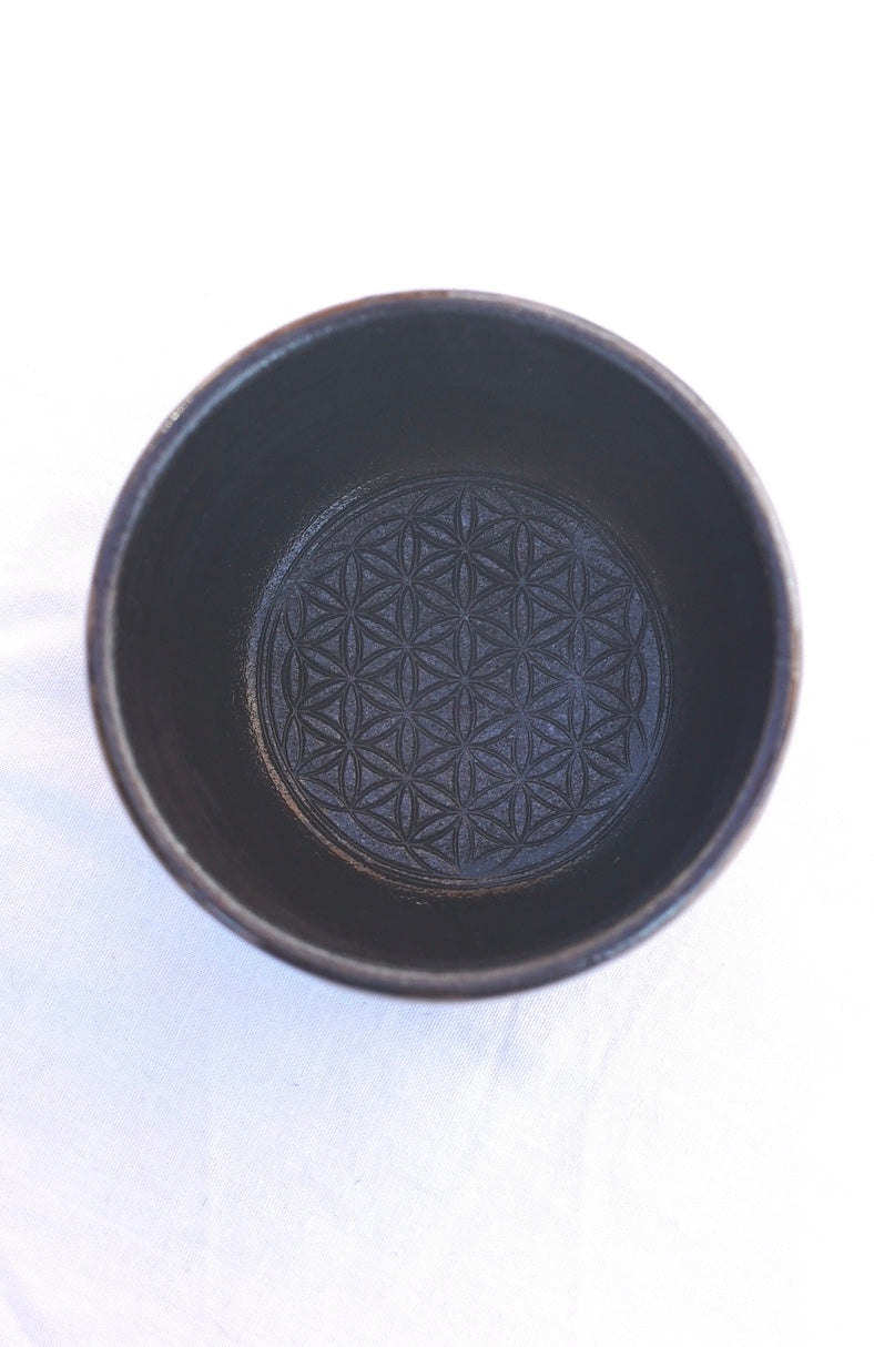 This mug was lovingly handmade by me on the potter's wheel from black clay. The "OM" symbol is carved in such a way that it appears raised on the cup. The mug is glazed with Agnihotra ash glaze on the inside and cocoa-colored glaze on the outside. The flower of life inside on the base of the cup and the integrated Agnihotra-Ash is a pleasure to drink from.
