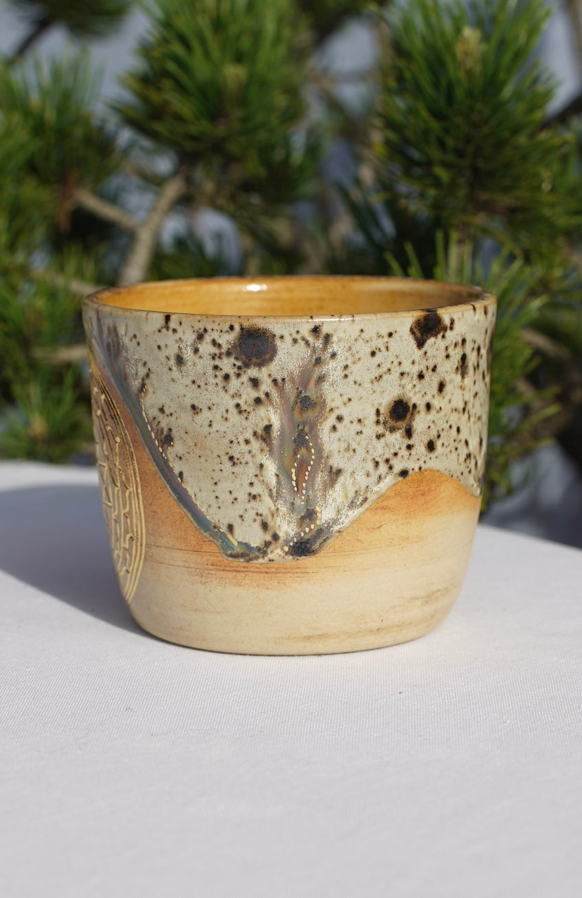 Dieser Becher wurde von mir in liebevoller Handarbeit an der Töpferscheibe. Das Sri Yantra wurde per Hand herausgearbeitet und mit 24 Karat Gold vergoldet. Innen auf dem Boden befindet sich die Blume des Lebens und der Becher ist innen mit Agnihotra-Aschglasur glasiert. Durch die Agnihotra-Asche wird auch der Kakao während der Zeremonie aufgewertet und erhält hexagonale Strukturen und kann so seine Heilwirkung 100% entfalten.