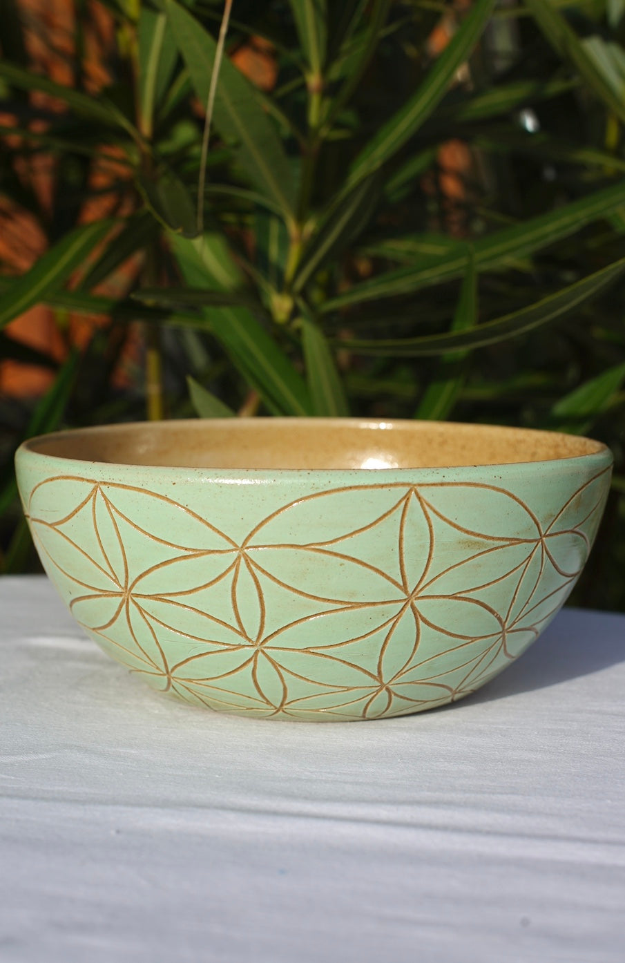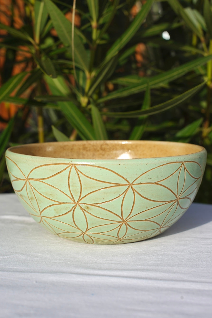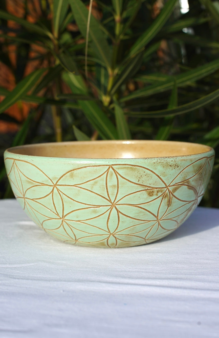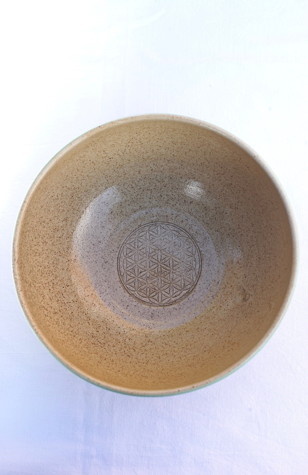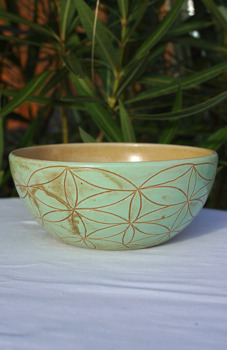 Diese Schale wurde von mir in liebevoller Handarbeit erst an der Töpferscheibe gedreht, mit eingefärbtem Ton bestrichen und die Struktur der Blume des Lebens mittels Sgraffito-Technik eingeritzt. Im Inneren ist die Blume des Lebens. Durch die eingebrachte Agnihotra-Asche, ist ein Genuss daraus zu trinken oder zu essen. Die Agnihotraasche ist im Ton und auch in der Glasur enthalten. Die Ascheglasur enthält keine chemischen Nebenstoffe und ist damit vollkommen natürlich. Diese Asche verändert die Kristalle der Getränke in der Schale hin zu lebendigen hexagonalen Strukturen (erstmals nachgewiesen durch Masaru Emoto) und macht sie so für den Körper besser verwertbar. Die Asche soll sogar dazu beitragen Schadstoffe durch Umwandlung zu neutralisieren.
