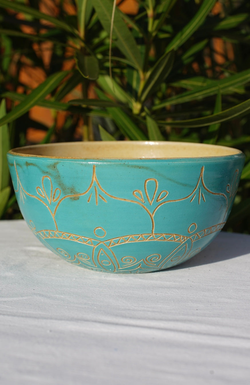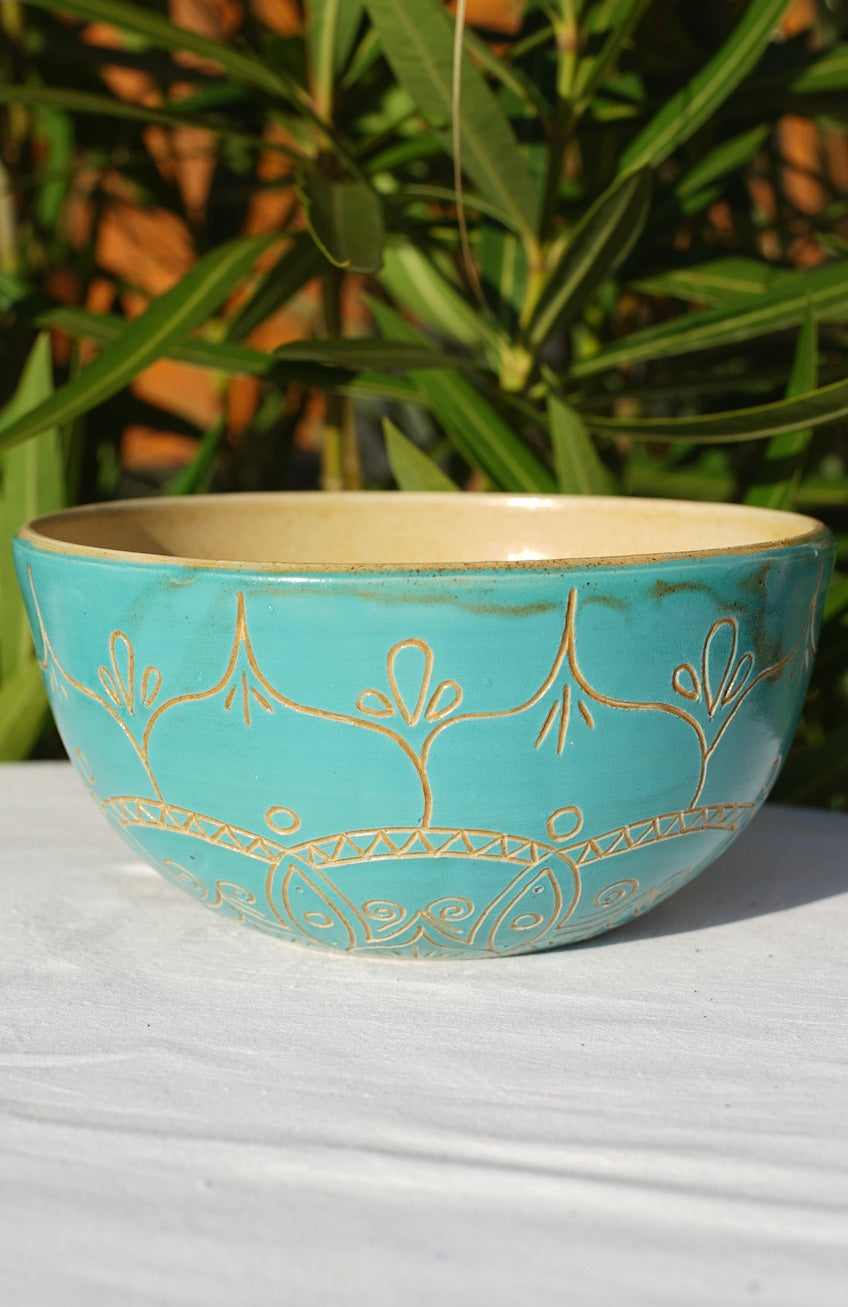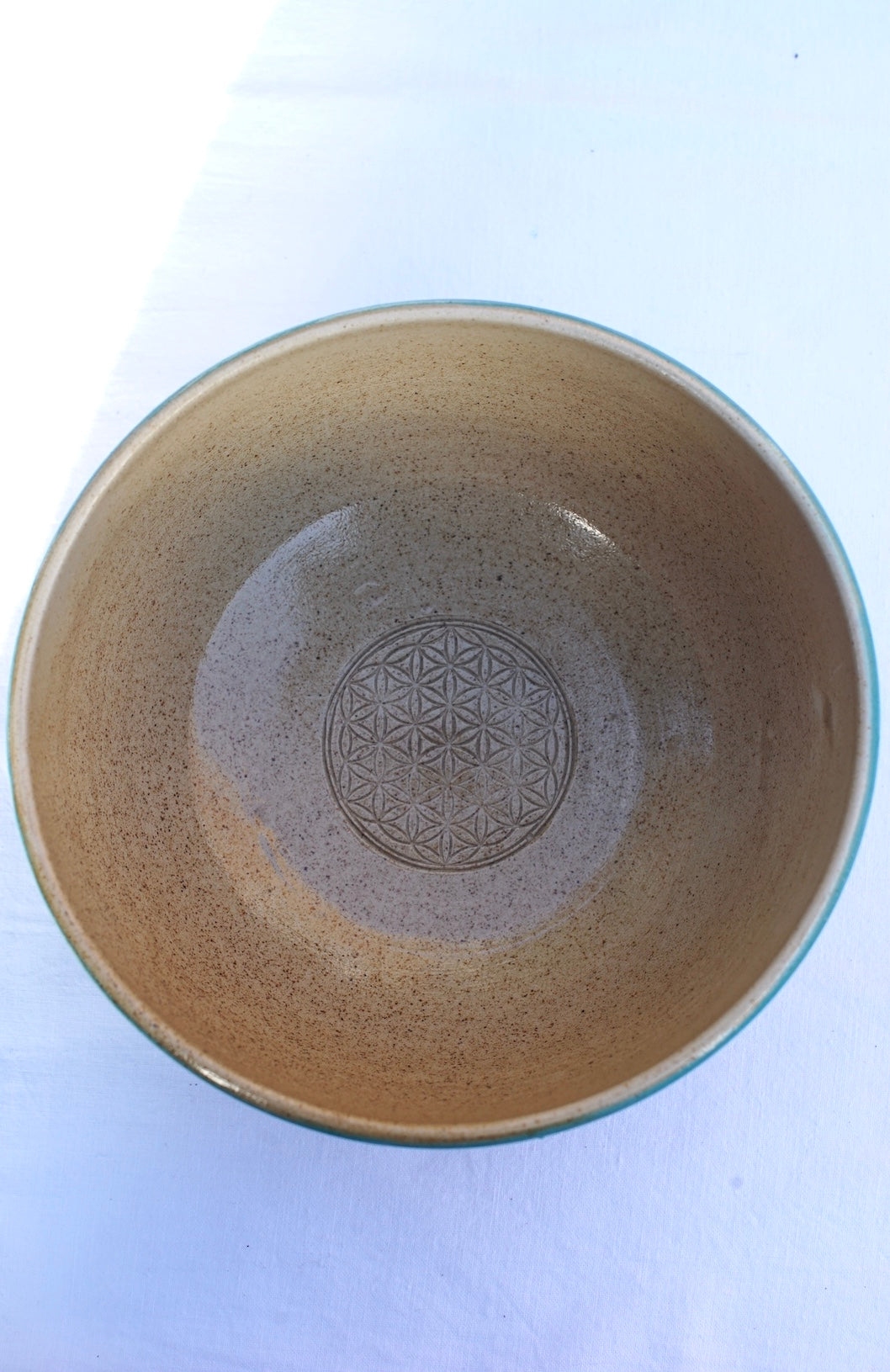 This bowl was lovingly turned by hand on the potter's wheel, coated with colored clay and the mandala carved using the sgraffito technique. The flower of life can also be felt inside. The Agnihotra ash inside makes it a pleasure to drink or eat from. The Agnihotra ash is contained in the clay and also in the glaze. The ash glaze contains no chemical additives and is therefore completely natural. This ash changes the crystals of the drinks in the bowl into living hexagonal structures (first demonstrated by Masaru Emoto), making them easier for the body to utilize. The ash is even said to help neutralize harmful substances by transforming them.