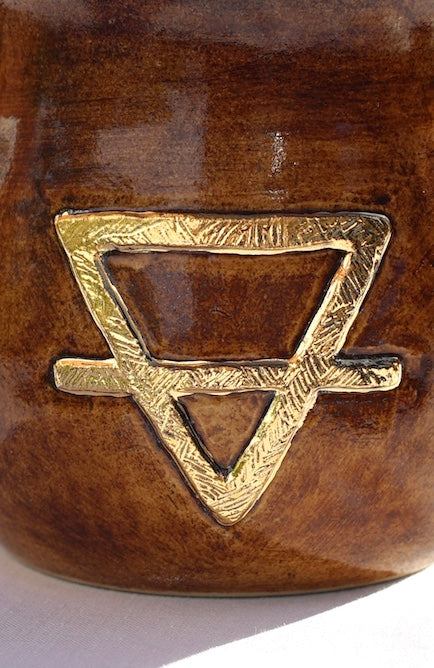 Nutze und verbinde dich mit der Kraft der Elemente. Die Herstellung der Tasse ist pure Alchemie. Z.B. entsteht erst durch die Hitze beim Brennen aus der schwarzen Agnihotra-Ascheglasur die schöne goldbraune Farbe. Du siehst auf der Tasse das alchimistische Symbol für die Erde in 24 Karat Gold. Alles ist per Hand hergestellt und vergoldet.